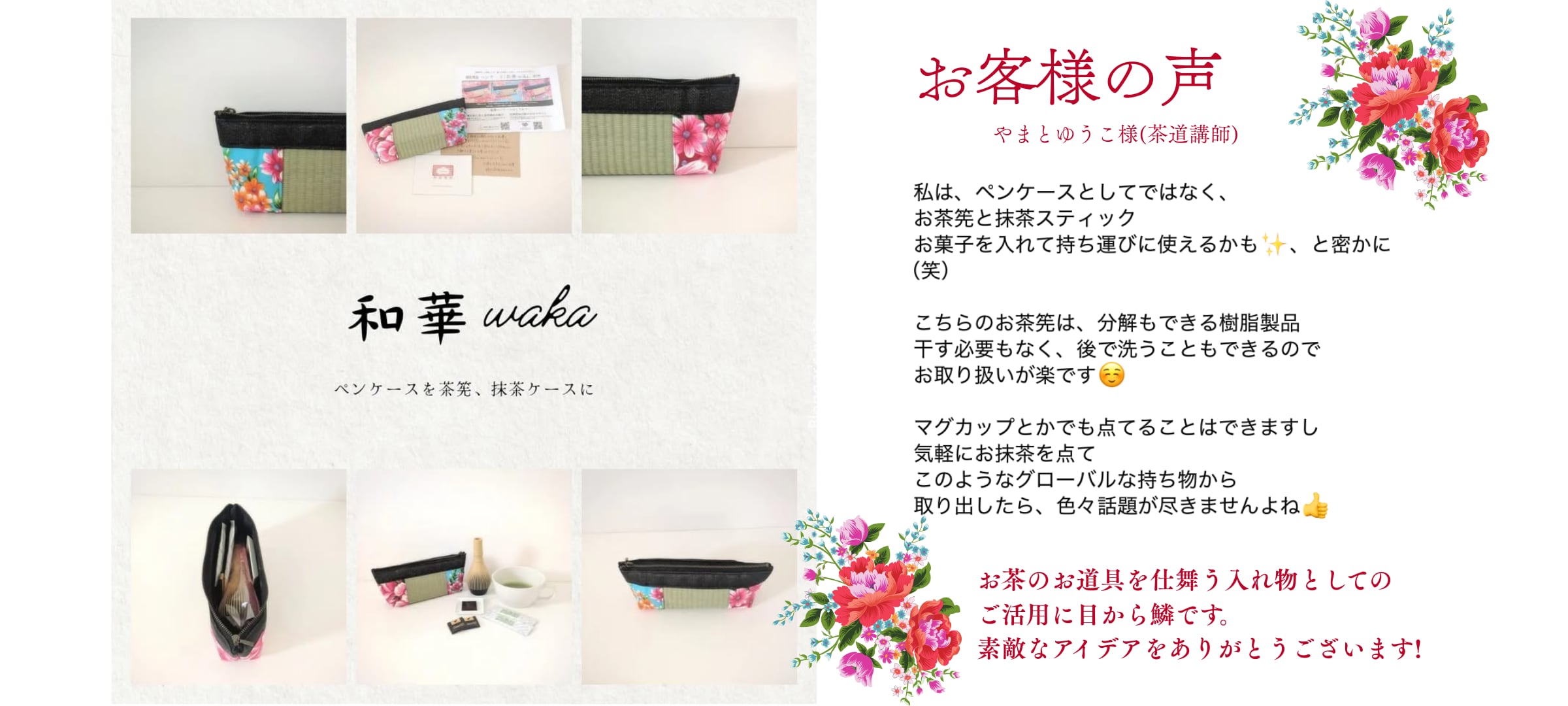 ■ カラー:赤 ■ サイズ:W21 x H8.5 x D4.5(㎝) ■ 個数:限定個数(以降春までに入荷予定) ■ 製造国:日本 ■ 発送・注文に関する情報や注意事項: ご注文後、通常5日以内に発送いたします。入荷状況によっては発送までお時間をいただく場合がございますので、ご了承ください。 ■ お手入れ方法: 汚れた箇所を硬く絞った布で優しく拭き取って下さい。直射日光を当てますと変色や劣化の原因になります。 ■ その他の情報や注意事項 一つ一つが職人による手作りのため商品の色合いや柄が少しずつ異なります。あらかじめご了承ください。 ご質問やご不明点がある場合は、ショップのお問い合わせからお気軽にお知らせください。 ********************************* 和華waka 〜台湾の美しさと和の心を持ち歩く〜 古き良き日本の文化と、台湾の伝統が交わる瞬間、一体どんな化学反応が起こるのだろうか。和華wakaは、そんな「日本と台湾を結ぶ文化の架け橋」というコンセプトのもと生まれた台湾の美しさと日本の和の心を融合させたブランドです。 この企画には、松葉商店様の協力を得て実現した特別な背景があります。 和と華が調和する、心ときめくひと品をあなたに贈ります。 【和華ペンケースのこだわり】 和華ペンケースは、美しさだけでなく、実用性も兼ね備えています。 ★畳の耐久性と自然素材の魅力 軽量で持ち運びやすく、しっかりとした耐久性がありながらも自然の温かみを感じることができます。畳のイ草の香りは主にフィトンチッド、ジヒドロアクチニジオリドなどが含まれています。 フィトンチッドという成分は、アロマテラピーの代表的な芳香成分としても知られており、いわゆる「森林の香り」です。 フィトンチッドは、強力な消臭・脱臭効果、殺菌効果、ストレスホルモンの減少、ガンを防ぐNK細胞の活性化など、様々な効果があります。子どもたちに触れられても安心な素材は、家庭を持つ女性にも嬉しいポイントです。 また、ファスナー部分は畳の縁に使用する素材を使用。丈夫な素材なのでファスナーの開閉もスムーズです。 ★台湾花布の鮮やかなデザイン 花布の華やか模様は使うたびに女性の心をワクワクさせてくれます。 パッと目を引く鮮やかで明るいデザインは、そっと置くだけで注目の的。慌ただしい準備の中でもバッグの中で迷子になることもありません。 ファスナー部分の黒い縁も、花柄の華やかさに合わせラメが上品に光る素材を起用いたしました。こちらのぜひ目で楽しんでいただきたいです。 ★ペンケースとしての実用性 複数のペンが収納可能、付箋も収納できる高さで開閉しやすい設計。 お子様の学校行事や仕事の打ち合わせなど、さまざまなシーンで使いやすさを実感できます。 大切な人へのギフトとしても最適です。 台湾と日本、二つの文化の美しさを感じる「小さな贅沢」を、ぜひご体感ください。